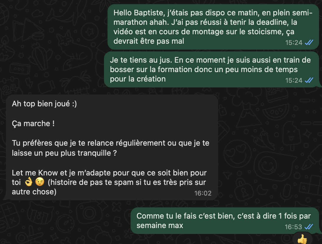 Dans le mentorat, tu débloques l'accès à mon whatsapp et la possibilité de me poser des questions à tout moment.